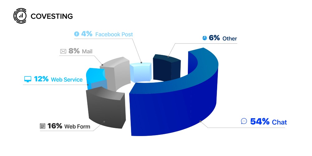 53% of questions came through the most popular channel, Live chat.
