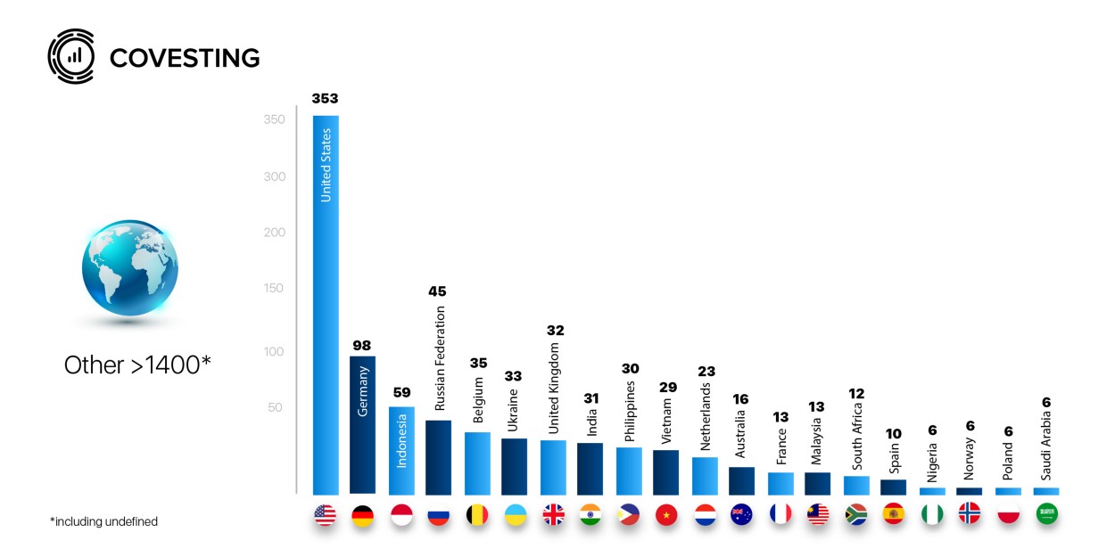 United States of America, Germany, Indonesia, Russian Federation, Belgium, Ukraine, United Kingdom, India, Philippines, and Vietnam.