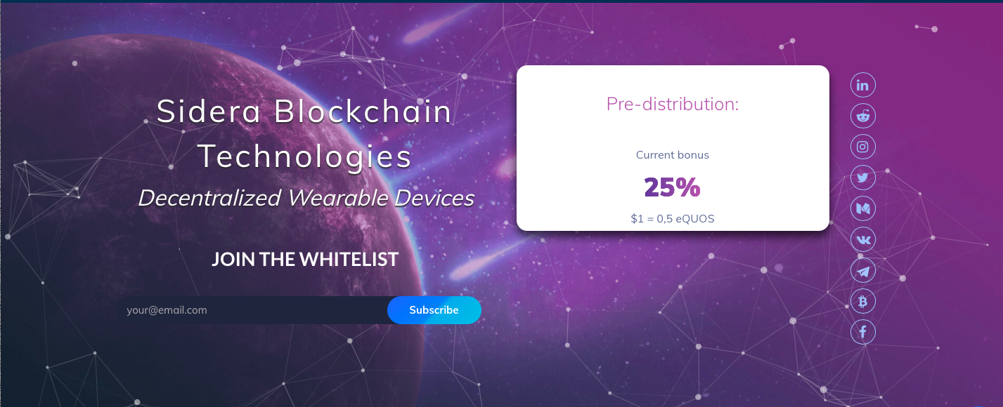 The SIDERA team announced a reward program for everyone who wants to participate in the project. Total compensation fund will depend on the results of the ICO. Even after the token sales phase is closed, tokens can be exchanged or purchased further with SIDERA SmartBit (band or watch).