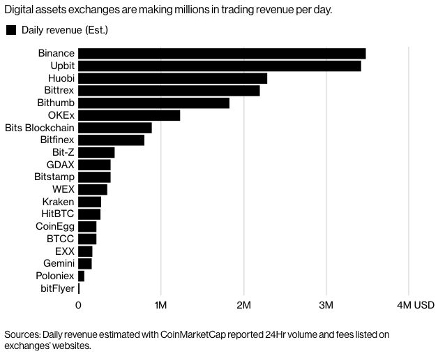 Bloomberg measured the fee income of the main exchange on March 2018 in accordance with the exchange's 24h trading amount. The fee rate is based on the announcement in the official website of each exchange. The calculation of the fee rate is generally between 0.1% and 0.3% of the transaction amount.