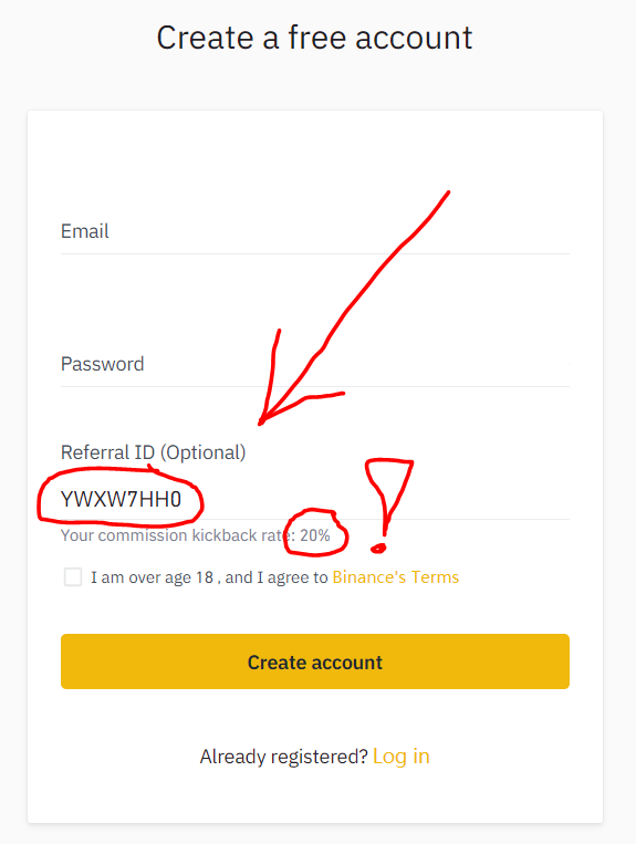Take advantage on a Binance Commission Kickback Rate of -20% commission rate as Binance referral bonus, write the Binance invitation code YWXW7HH0 in the field “Referral ID (Optional)” in the registration form as in the figure below or easy click the Binance ref link https://www.binance.com/en/register?ref=YWXW7HH0 for process your registration.