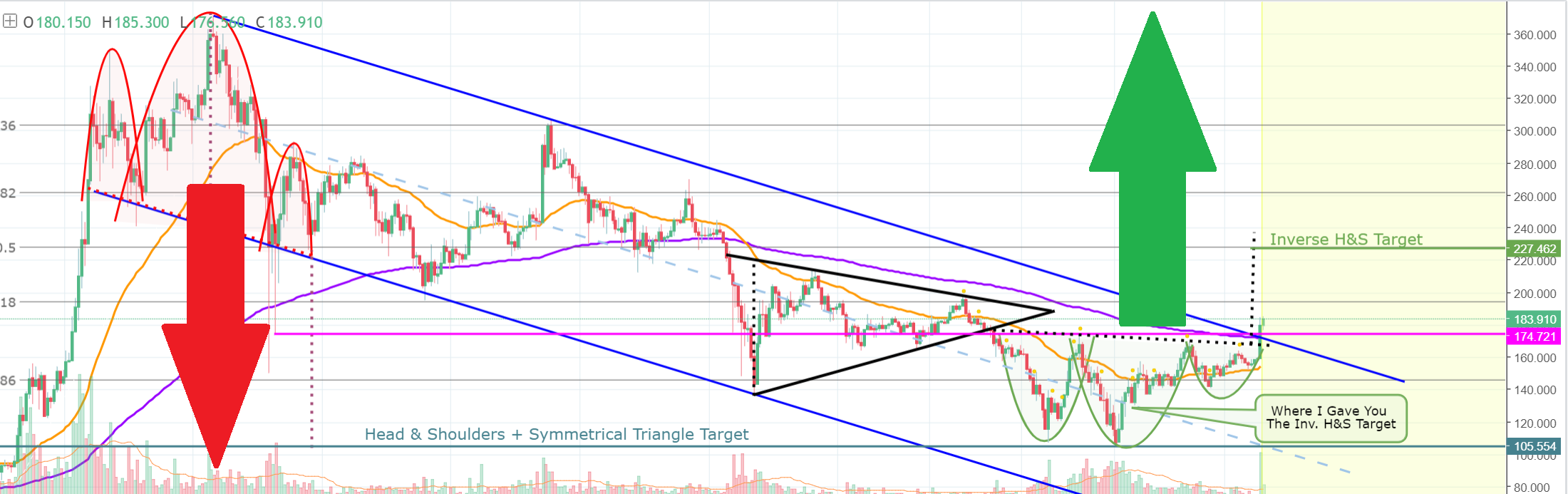 Dall'immagine potete anche notare due pattern di cui ho parlato nella guida (link in basso); ovvero l'head&shoulder (con conseguente colata a picco) e il più recente head&shoulder inverso, con, si spera, seguente bull run. Il prezzo target è di circa 230$ ma è probabile che LTC inizi una bullrun prima del lancio di LitePay per poi affrontare l'attesa correzione del mercato di Marzo.