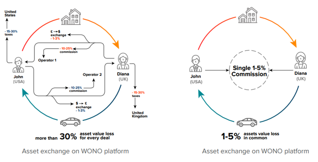 WONO presents itself as the solution to this growing centralisation. As a Blockchain project, WONO will only charge 1-5% commission and aims to reduce the cost to vendors and users greatly. It can charge so low, because as a blockchain project, all transactions are run by smart contracts, and so they bypass expensive middlemen companies (e.g. UBER or AirBnB) and allow the customer to liaise directly with the asset owner.