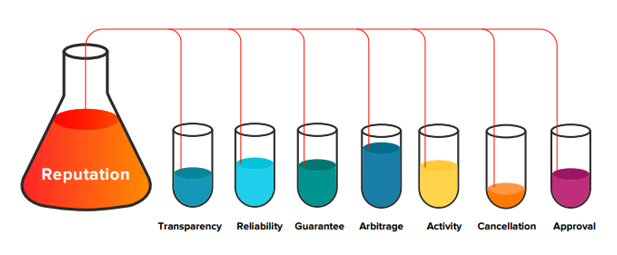 This is a reputation that is built from several different factors, including approval and ratings from others, reliability, activity on the platform, with different weights attached to each of the different roles played, etc… This reputation will affect the amount of deal commission the user receives.