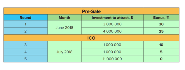 The ICO will take place in July, 3rd and 4th Rounds will have a bonus of 10 and 5% respectively, but only a million dollar sale. The bulk of over half the tokens will be sold in the 5th round with no discount.