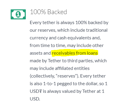 The problem of adding "receivables from loans" into the reserve wording means that credit risk is introduced to the system. So now, instead of being 100% backed by currency (eg a pile of cash sitting in an account) Tether has loaned out some of that pile to third parties. What if those third parties default? Then my Tether would not be 100% backed then.