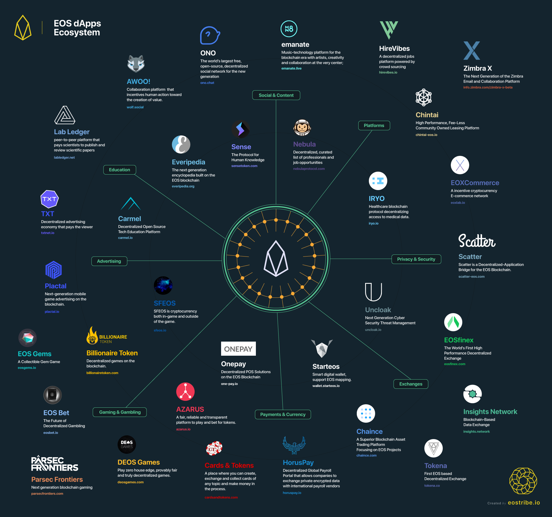 Here, you will find a second info-graphic (by Koreos) showing us part of the different dapps already announced inside the EOS ecosystem: