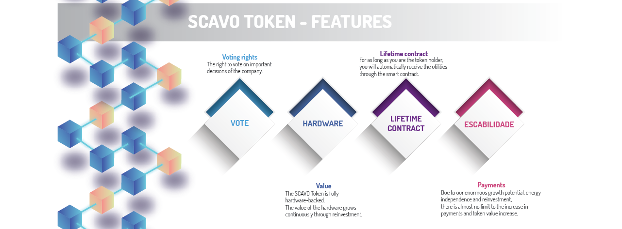 SCAVO tokens will be fully supported by mining hardware as well as by other equipment which is part of renewable energy generation which will be in a real physical place producing 24 × 7 crypto assets.