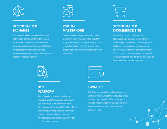 Exosis is a multi-platform blockchain ecosystem that provides a robust platform for crypto investors to invest in the cryptocurrency industry with ease and peace of mind. It provides a one-stop place for all your crypto needs by combining five different platforms in one; a decentralized exchange, a decentralized e-commerce platform, an over-the-counter (OTC) trade platform, a virtual masternode platform, and a multi-platform e-wallet.