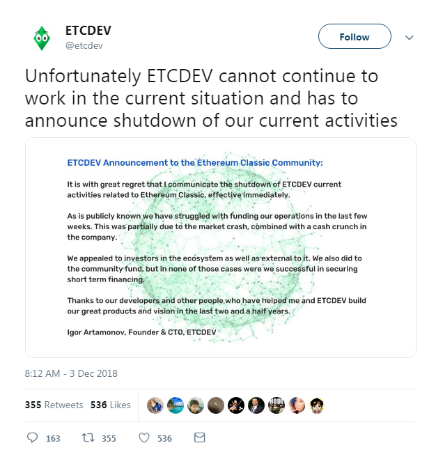 After 2 and a half years in the market Ethereum Classic Dev posted on their twitter last December 03 , 2018 that they are lacked of funds already and this means that the ETC will soon to be shutdown . Well, as of today we can still see that ETC still up on exchanges but since team already abandoned it time will come no more people will trade it and it will be delisted in exchanges .