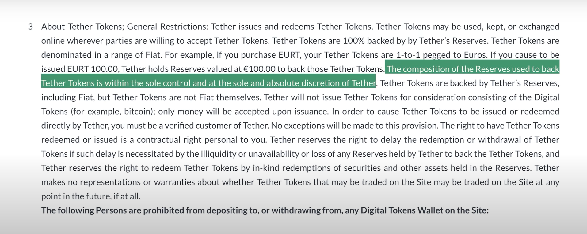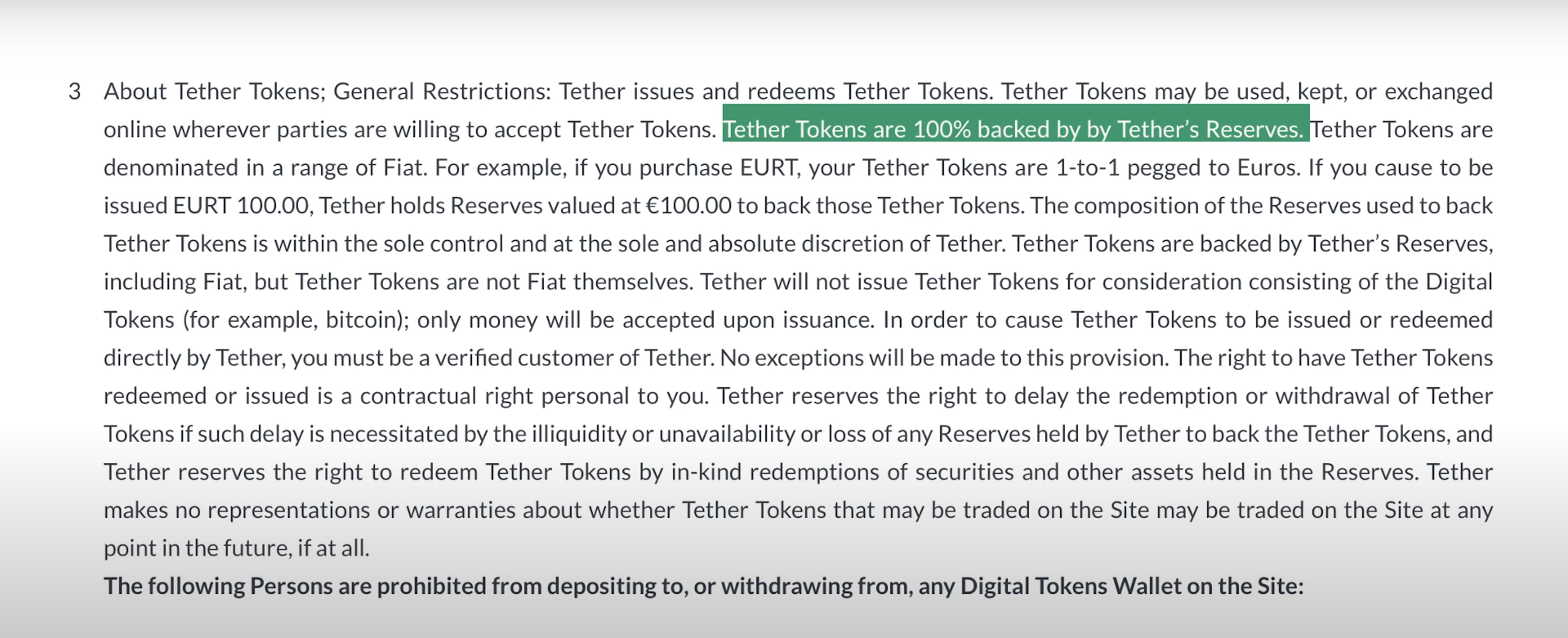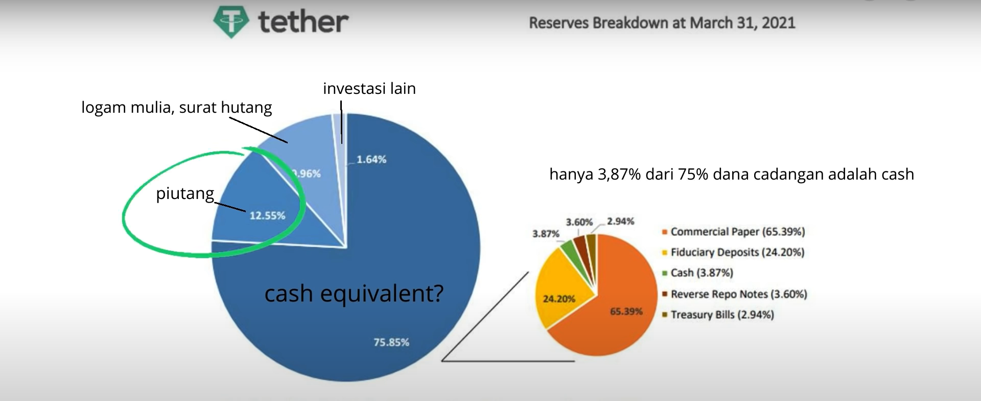 Berdasarkan stetement perusahaan terakhir bahwa USDT dibackup oleh dana cadangan, bukan dollaar. Dan dalam dana cadangan, tether hanya menyimpan cash sebanyak 3,8 persen saja. Sebagian besar asetnya disimpan dalam bentuk komersial paper. Yang mana hal ini sangat susah untuk diaudit dan diminta pertanggungjawaban.