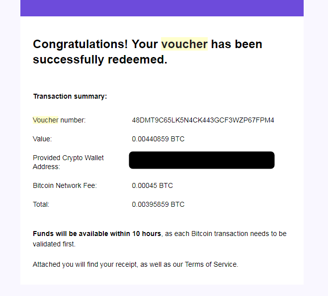 It is followed only by a very similar page where you type in your wallet address instead of the voucher code. You can also opt in a confirmation email to follow your delivery's status. They say it can take up to 10 hours, but mine finished transfering in about 40 minutes. Here's the email I got: