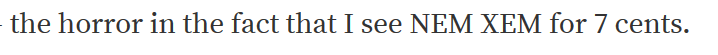 I told you XEM would be worth 7 cents!gefa (54)in #cryptocurrency • 7 years ago this was in this post https://steemit.com/cryptocurrency/@gefa/i-drop-nano-now-i-use-only-usdt-and-wait-dump-crypto-tommorow Yeah I was expecting a little early! than this happened! But I waited! My next prediction if this is interesting, Ethereum will cost 450$ Take it now for only ~ $135 #bitcoin #profit #invest #gefinvest
