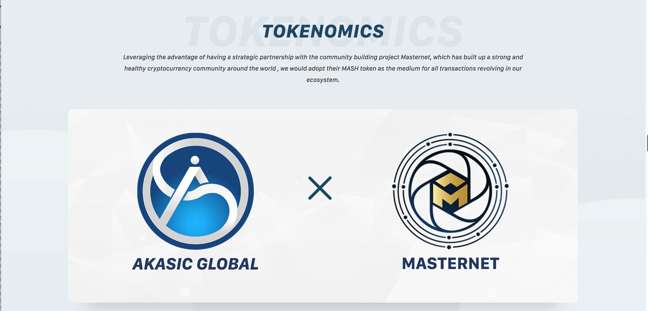 Leveraging the advantage of having a strategic partnership with the community building project Masternet, which has built up a strong and healthy cryptocurrency community around the world , they adopt MASH token as the medium for all transactions revolving in Akasic Global ecosystem.