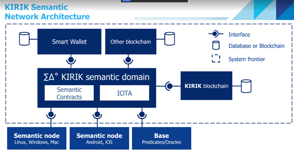 The KIRIK concept is not based on Blockchain as the distributed ledger, but on semantic smart contracts (ΣK) which are not linked to any specific blockchain platform. Semantic smart contracts allow to specify protocols that can bind operations and transactions made in different Blockchain platforms and other external systems, like banks or exchanges, into one integrated transaction. From the Mathematical Logic’s formal point of view a semantic smart contract represents a formal theory that has a property of constructivism, which means that, for example, any expression in the form of Δ0-formula can be verified whether it is true or false in a certain constructive model of that theory.