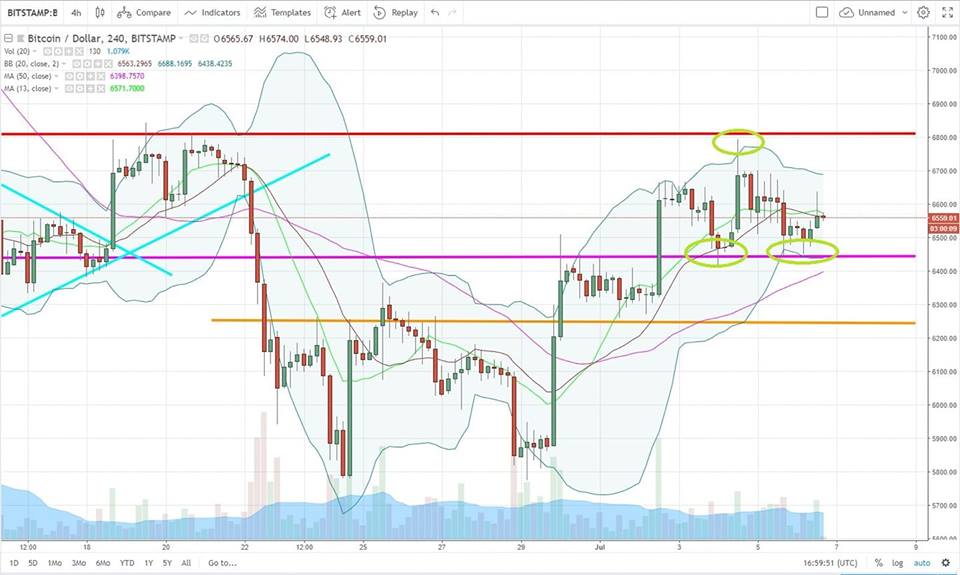 The test of our support line at 6450$ created a little bounce and we are now in the middle of our 2 lines. The UP looks like doing a little pause. Let's see if we will go test soon our resistance line around 6800$ and more important break it. As I'm saying you since several days, this line is the key.