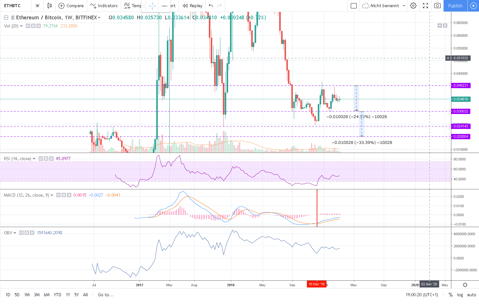 The Double Top pattern on the ETH / BTC is having a breakout target of around 0.03btc with a price target of around 0.02 btc, this would crush the level we were previously holding of around 0.024 and could lead to further decline, but for me this is looking like a possible pattern failure at the moment.