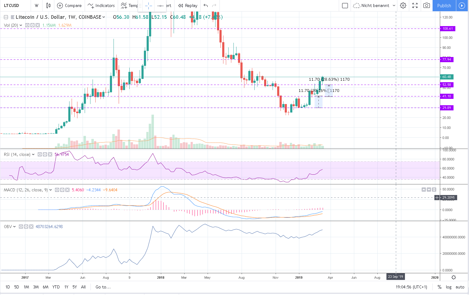 Litecoin already broke out of its double bottom pattern, breakout point at around 41§, with a target of 52$ and is currently extending its gains with a current price of around 60$.