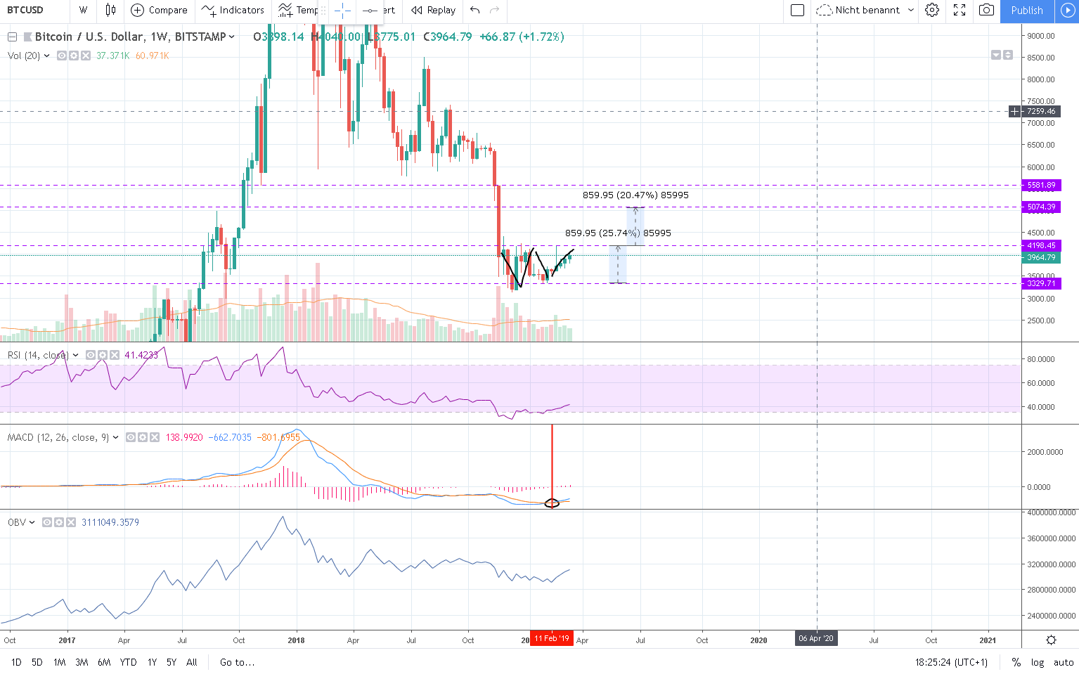 Weekly MACD had a positive crossover at around the 11. february 2019 already , and since then we have seen only green in the weekly.