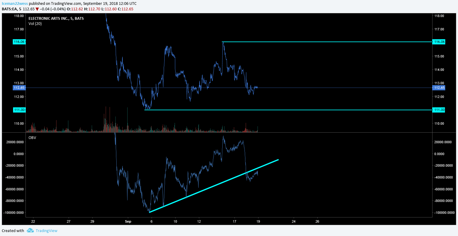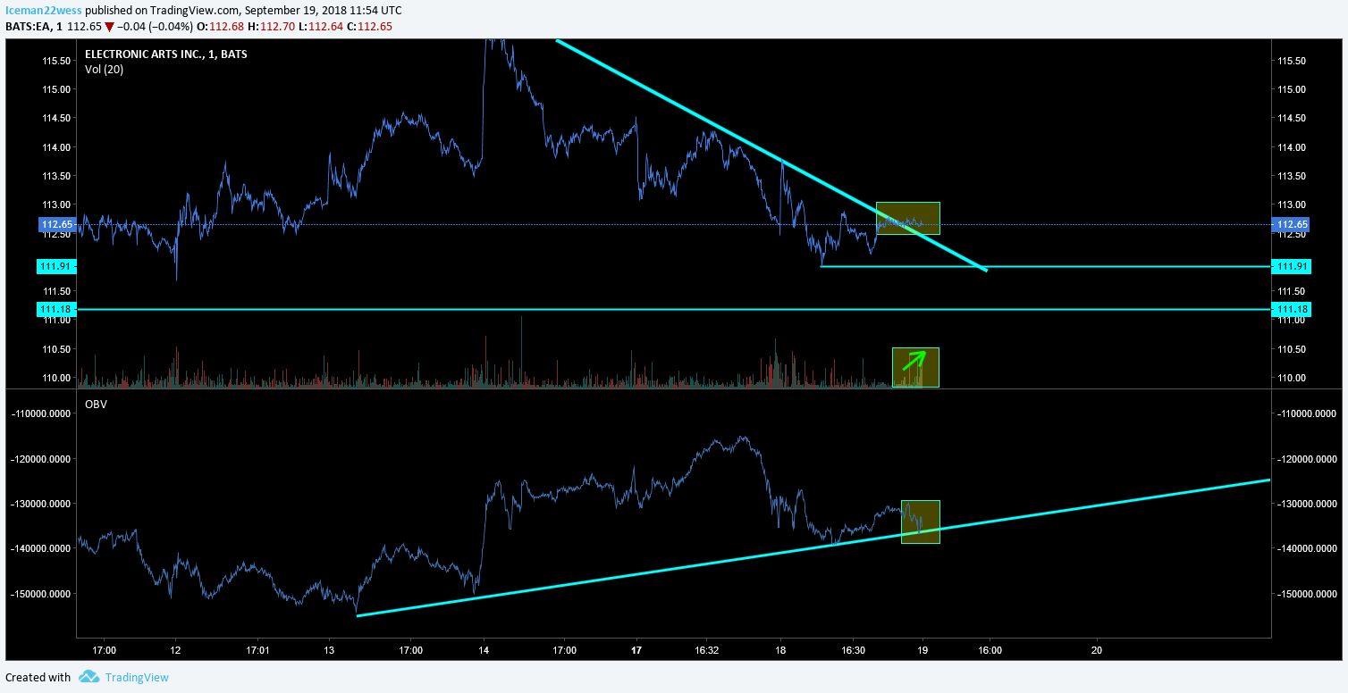 Here, It would look rather concerning that the OBV trend line has broken, and retested, and looks ready to plummet for another leg down. I would argue against this though as the volume has a yuge green bar to finish off the last one, and the support has more wiggle room to the downside allowing breathing room for this stock to slow the down trend down and reverse. Even with this bearish bias, I would argue it shows a downtrend that is ending, not beginning.