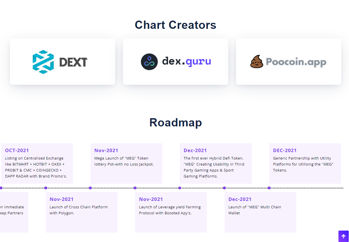 Так же, на официальном сайте проекта MegaBsc представлена дорожная карта, согласно которой, начиная уже с октября 2021 года, начнется листинг токенов MEG, на централизованных биржах. В ноябре будет запущен Cross Chain с сетью Polygon, а так же запуск лотерей и начало Фарминга. В декабре планируется сделать гибридным токен MEG, и получить партнерства с утилитарными платформами для использования токенов MEG.