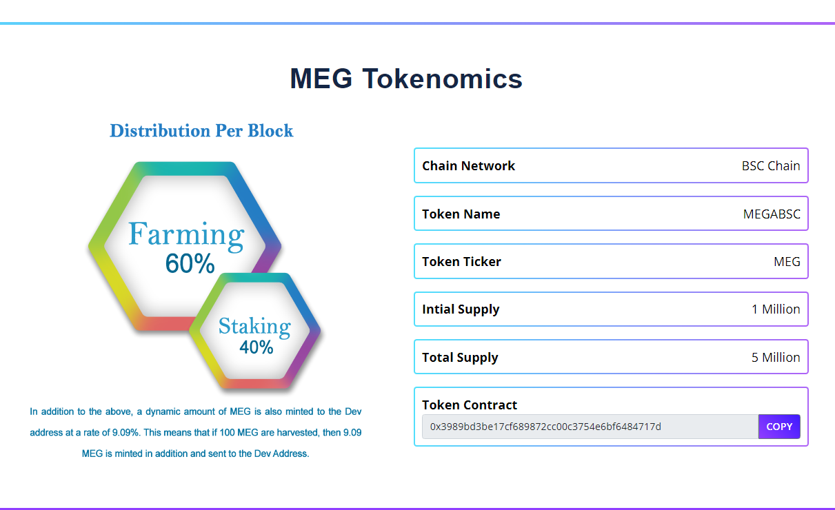 Проект MegaBsc выпустил свой собственный токен, который называется MEG. Этот токен выпущен с сети BSC Chain, а всего выпущено 5000000 токенов MEG.