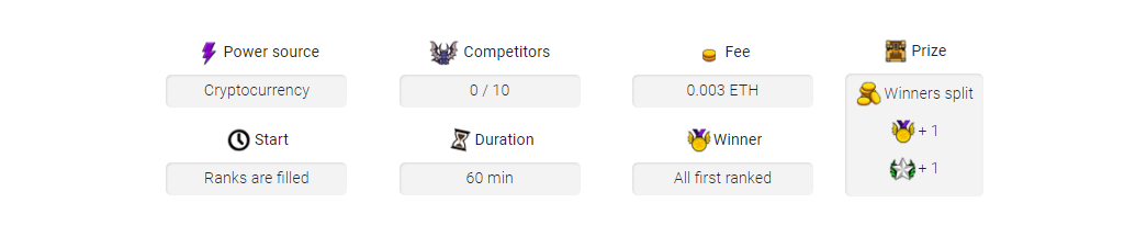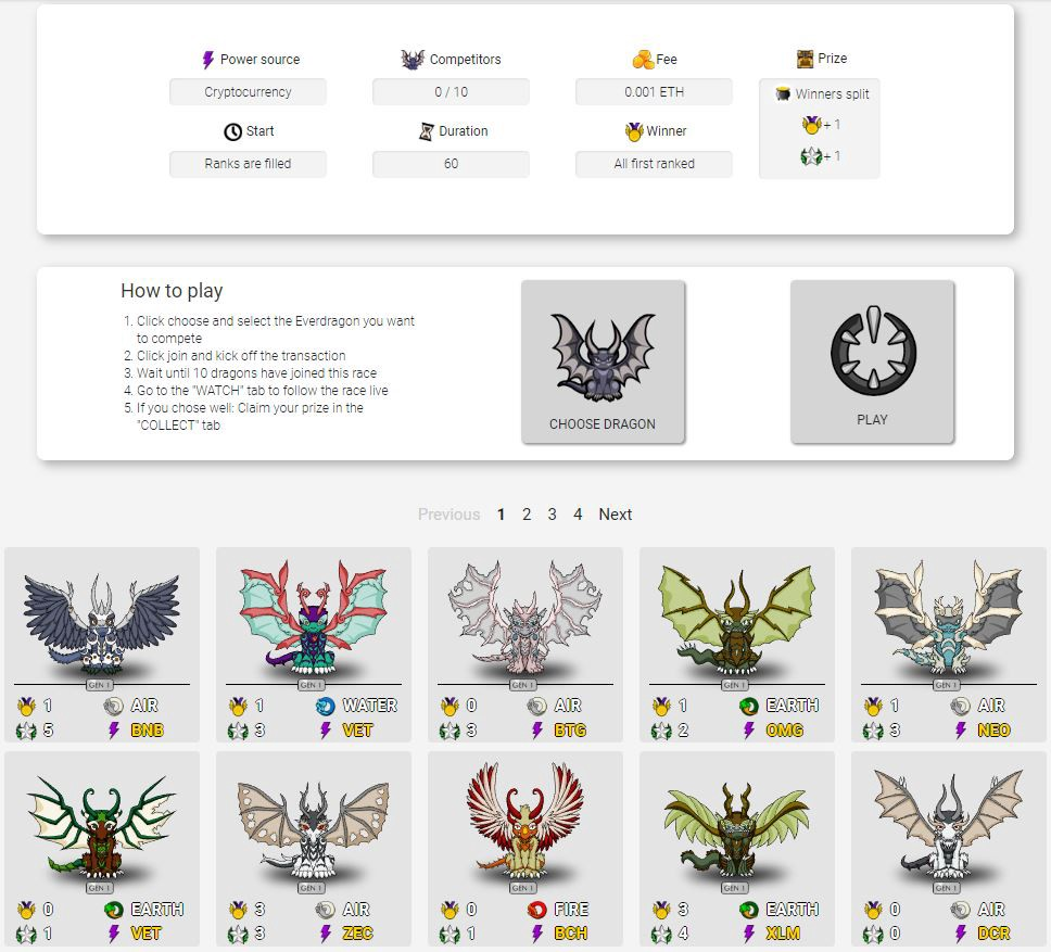 FEE: The entry fee to join the race is 0.003 ETH. This, minus the 3.75% platform cut and gas fee for oracle call, then becomes the winners prize pot. The owner of the winning Everdragon takes home the prize pot. If the winning coin is represented by more than one dragon, the pot is split between their owners.