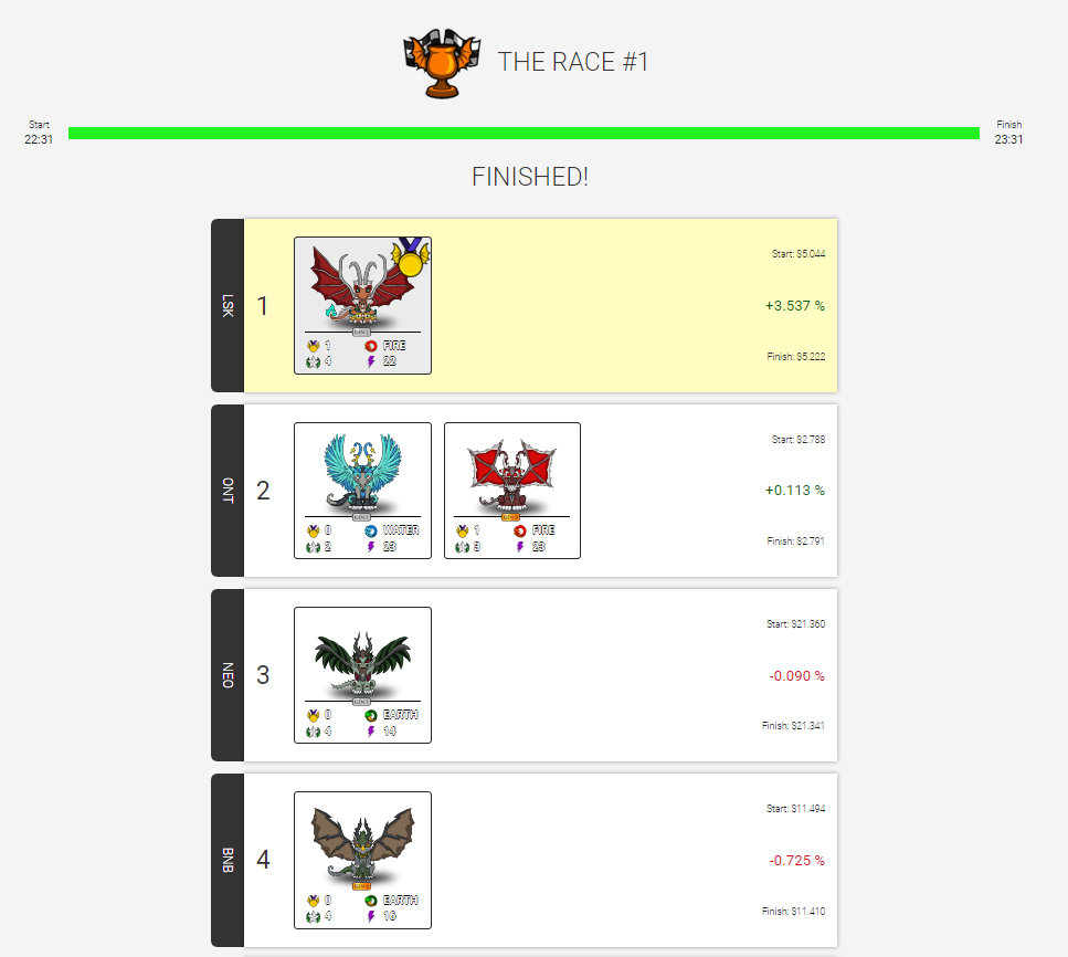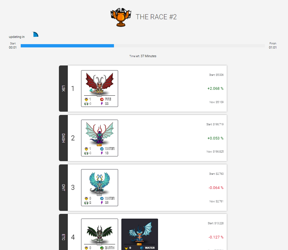 DURATIONS: Each race lasts one hour. During the race you can see all your competitors and the coins they represent. At the start and at the end of each race, the marketcap of each of the represented coins is recorded. During the race players can see how well their Everdragon is currently doing by following the race in the WATCH tab.