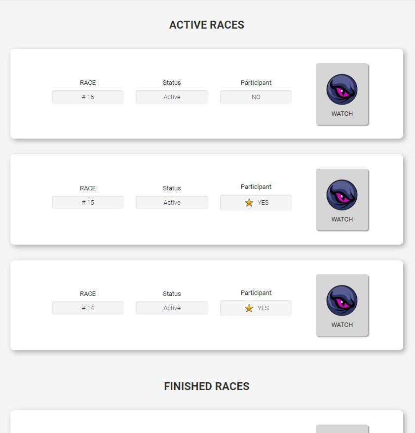 Once you have selected your dragon click Play and kick off the transaction in your wallet. When the transaction is confirmed your dragon is participating in the race. Wait until 10 dragons have filled the ranks then go to ‘WATCH’ on the main menu.