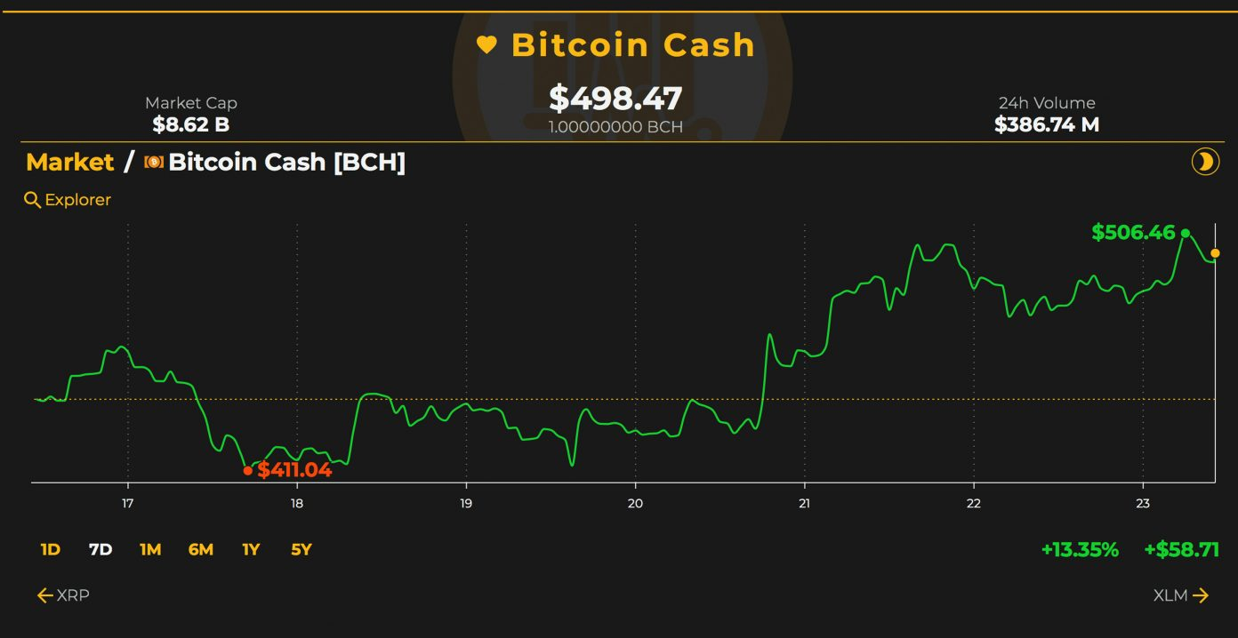 Bitcoin cash market action today is showing the spot price hovering at $492 per coin but this Sunday BCH is up 3.12 percent over the past 24 hours. Over the last week, BCH dropped to a low of $411 on September 17 and went back to a high of $501 on the 21st. The top bitcoin cash swapping exchanges today are EXX, Lbank, Hitbtc, Okex, and Huobi. The top currency pairs traded for bitcoin cash this weekend include BTC (51.8%), USDT (30.8%), ETH (6.9%), USD (5.1%), and KRW (2.3%). Bitcoin cash markets hold the sixth highest trade volumes today below eos (EOS) and above litecoin (LTC) volumes.