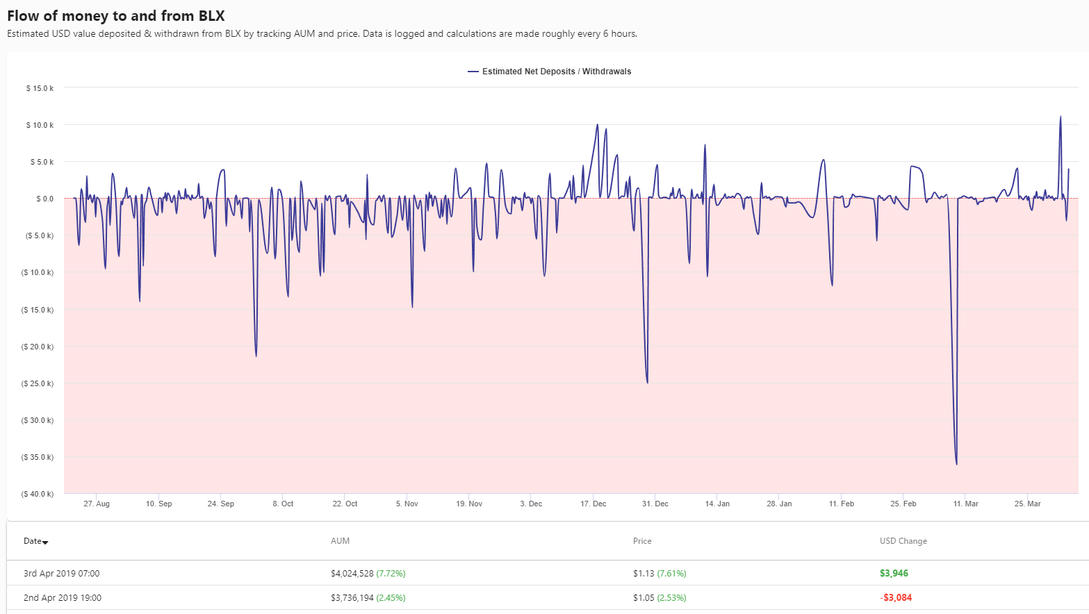 Estimated deposits / withdrawals based on AUM is now available in graph and table format for all public portfolios going back to August 2018. It could be found using the following url structure: https://icnhodler.com/moneyflow/BLX