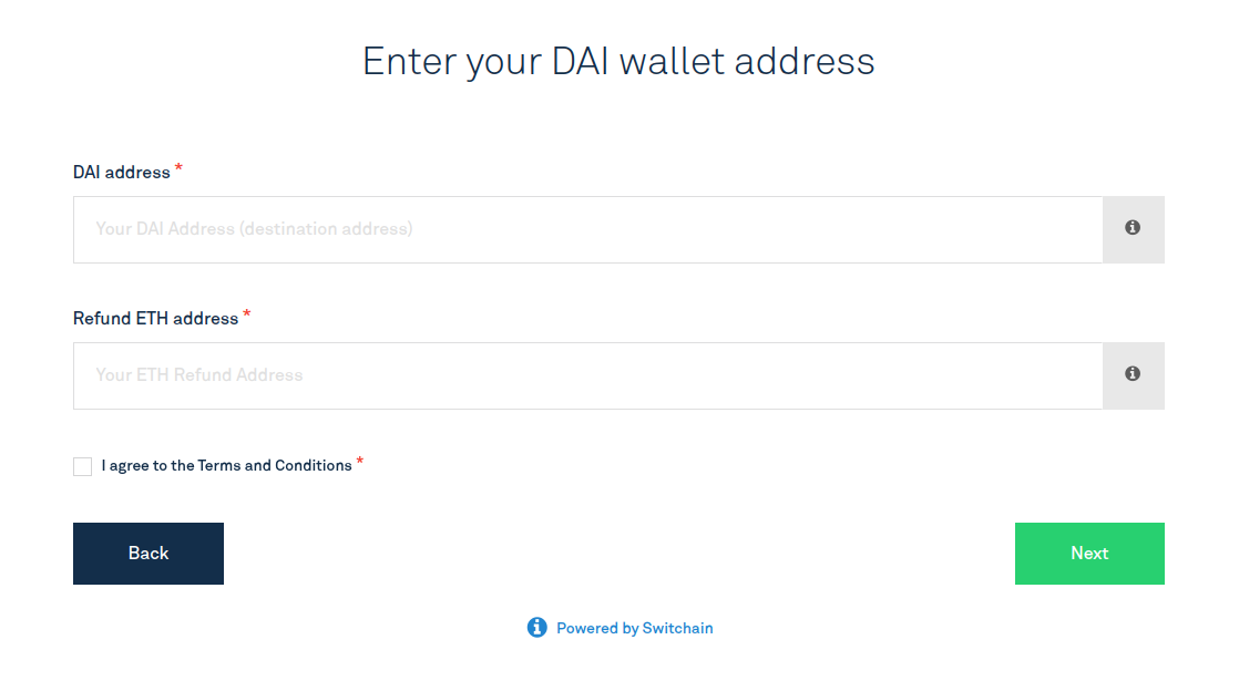 You are then prompted to input a DAI wallet address and ETH wallet address (in case the transaction fails and ETH needs to be refunded). Personally, I use Coinfy, but you're welcome to use any other ERC20 wallet.