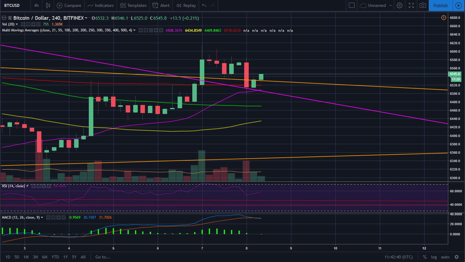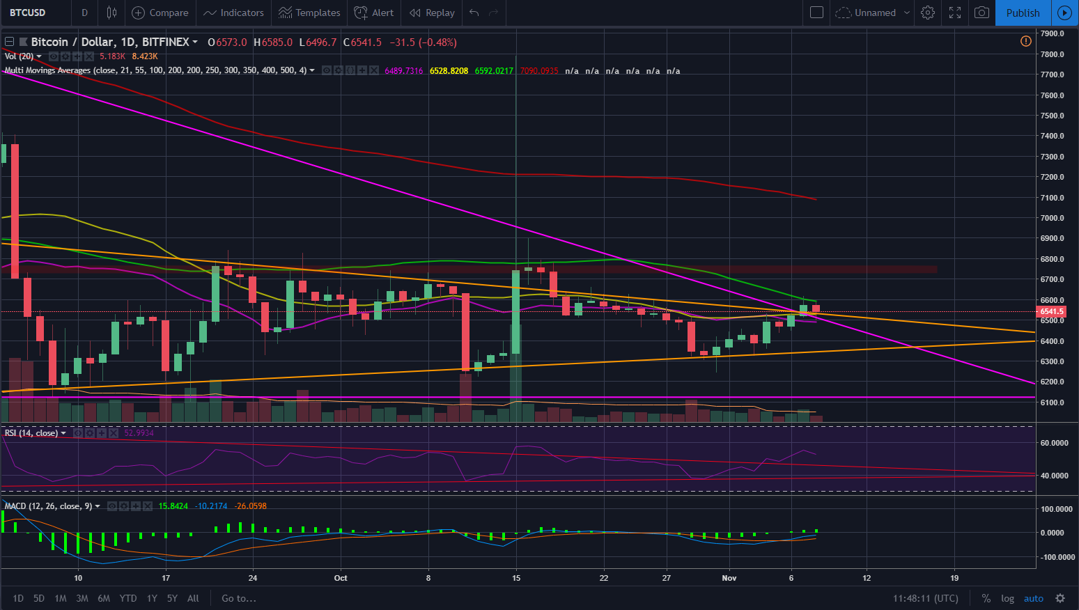 Now lets talk about the resistance BTC is facing. BTC is currently hovering below the 100DMA and above the triangle upper support lines, the 55DMA and the 21DMA, if BTC can get above the 100DMA, then the next resistance it faces is at around $6,750 which has been a strong resistance in the past for BTC.