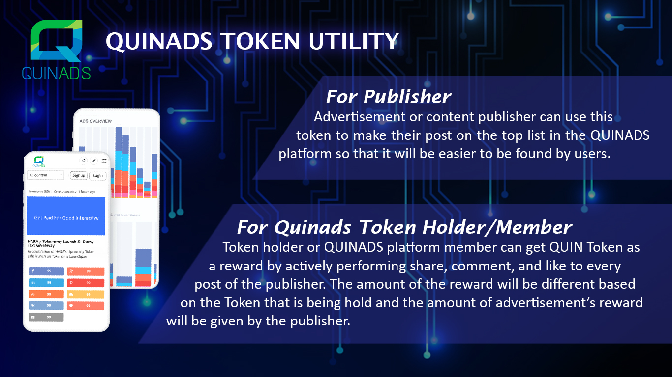 Quinads is an advertisement platform with blockchain based where we can create many contents in a form of video, picture, text, and also allows us to socially interact and rewarded by cryptocurrency. Quinads combines social interaction and cryptocurrency. Every user can create an interesting content and everyone who reacts to what they read or seen will get a reward. So that it is expected to gain attention and transform into a big community