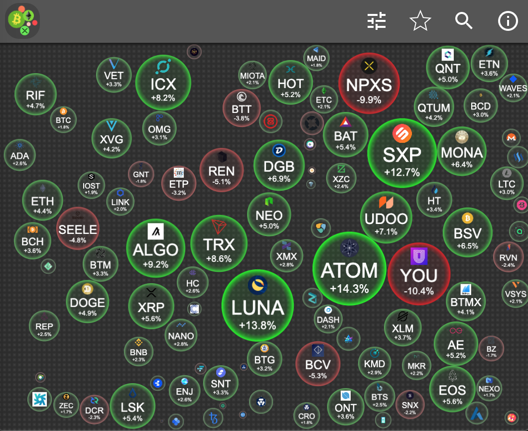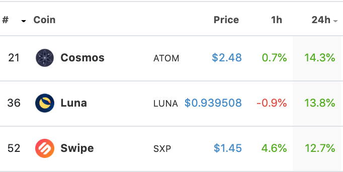 Double digit gainers In the top 100 market cap on coingecko.com: ATOM (14%), LUNA (13%) and SXP (12%).