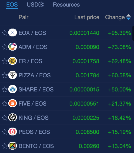 EOS projects on NewDex.io have quite a few double digit gains: EOX (95%), ADM (73%), ER (62%), PIZZA (60%), SHARE (50%), FIVE (21%), KING (18%), PEOS (15%) and BENTO (13%).