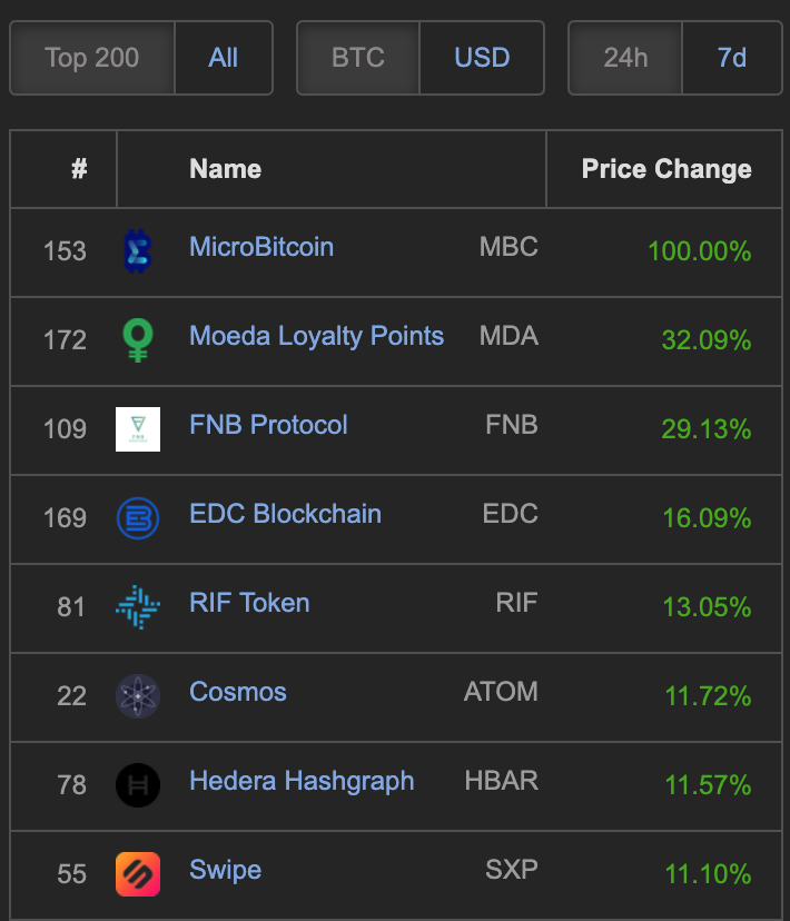 In the top 200 market cap MBC gains 100% on Coinpaprika.com: Double digit gains are being seen by: MDA (32%), FNB (29%), EDC (16%), RIF (13%), ATOM (11%), HBAR (11%) and SXP (11%).