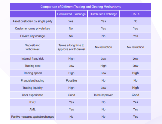 DAEX is a clearing solution for centralized cryptocurrency trading exchanges. Its clearing service is based on distributed ledger technology. Clearing and settlement rules are preprogrammed into clearing smart contracts on the DAEX clearing chain. The clearing process is automatic without people’ s interference. The objectivity of clearing is guaranteed by the consensus mechanism on the clearing chain. Also, customers’ digital assets are registered and stored on the DAEX’ s clearing chain. No other institutions or individuals can access these assets without the owner’ s permission.
