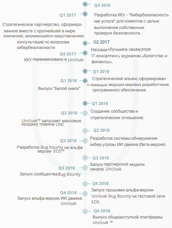 Четвертый квартал. Релиз системы вознаграждения на основе блокчейн технологии. Запуск альфа-версии системы мониторинга и готового сообщества Uncloak.