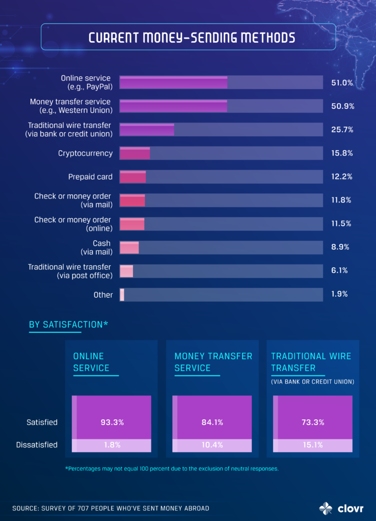 To illustrate the potential of cryptocurrency to create substantial disruption in the space due to its low cost and speed, the study revealed that in order to send $500 abroad, banks charge $52.05 on the average, compared to $30.75 for money transfer operators, $34.05 for the post office and $16 for mobile operators. Customer satisfaction was pegged at 93.3 percent for online services, 84.1 percent at money transfer services and 73.3 percent with traditional wire transfer, via bank or credit union.