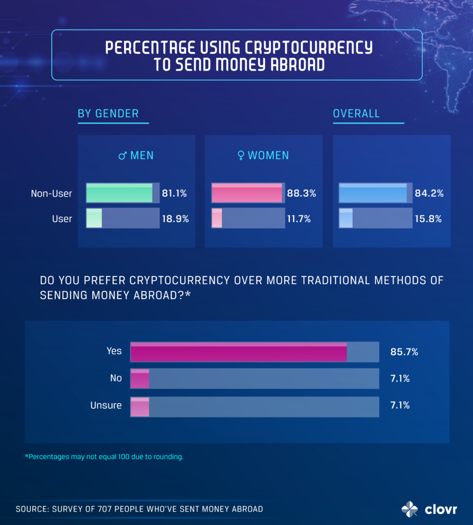 A new report by research focused cryptocurrency company Clovr, has revealed a significant upsurge in the use of cryptocurrency in remittances across the globe. The study, which surveyed the responses of 707 people sought to delve into their remittance habits, uncovering among other things the destination of transfers, the purpose of the transfers as well as the mediums (including cryptocurrency) by which the money was sent.