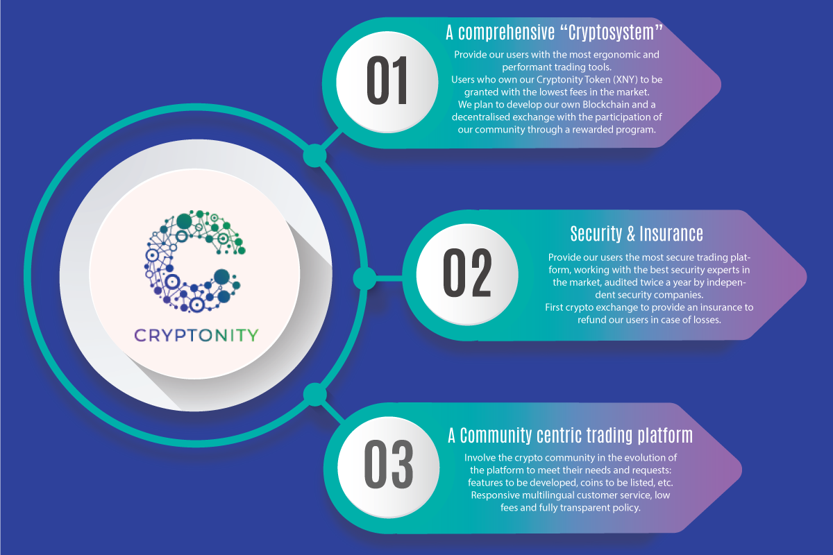 Cryptonity is the combination of two words: Crypto and Community. Simple but strong and meaningful, our goal is to be an exchange that is respected by the Cryptocurrency Community. We aim at providing the most comprehensive, secure, transparent and collaborative exchange platform in the market. We want to bring good vibes to the Crypto World, breaking with the ‘only profit’ policy of most exchanges.