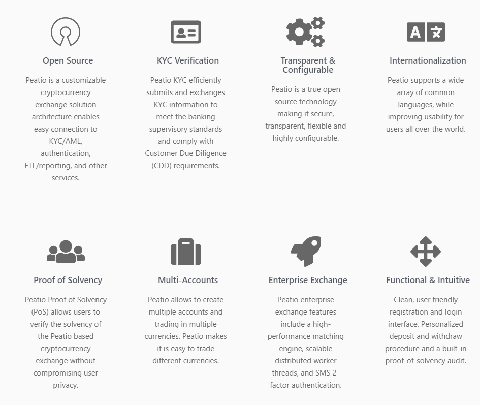 Corporate exchange. Peatio enterprise exchange capabilities include a high-performance compliance mechanism, scalable distributed workflows, and two-factor SMS authentication;