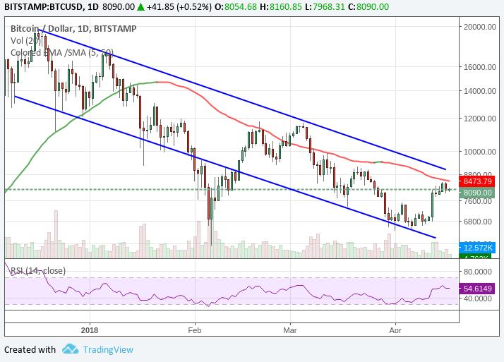 Bitcoin remains in a bullish territory for now and is looking at further gains, though a pullback is possible if support at $7,900 is breached, according to technical studies.