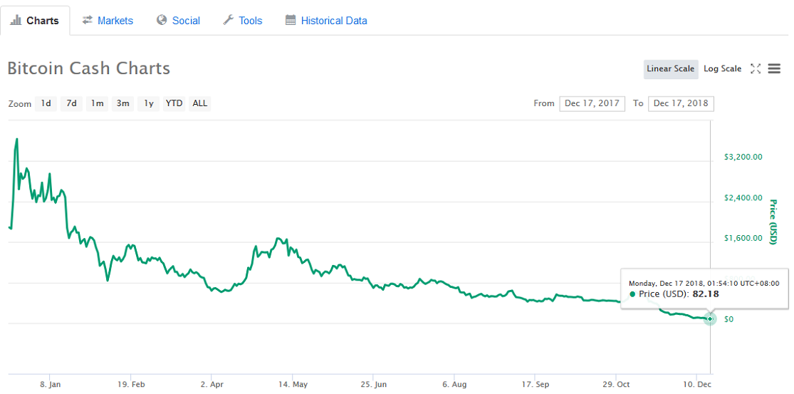 At the start of 2018, Bitcoin Cash was around $2500, with a value of 0.18 btc and Bitcoin Gold was around $260 with a btc value of 0.018