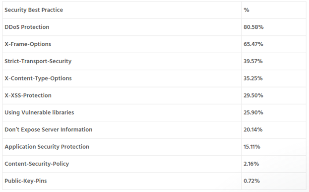 ‘…less than 40% of them are using headers like the Strict-Transport-Security header or the X-XSS-Protection header. 20% expose server information which isn’t a security vulnerability in itself but that clearly shows the low level of security best practices implemented. And 26% of them use frontend libraries with known vulnerabilities. Only 2% implemented a Content-Security-Policy that, if done well, can offer powerful protection against clickjacking or XSS….’