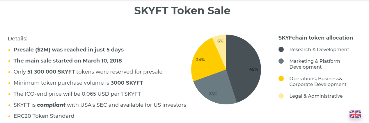 The ICO end price will be 0.065 USD per 1 SKYFT token