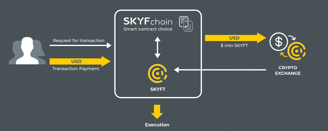A user requests a transaction in SKYFchain and pays securely in fiat money through his smart contract. SKYFchain acquires SKYFT tokens