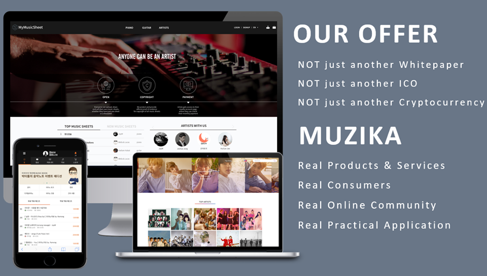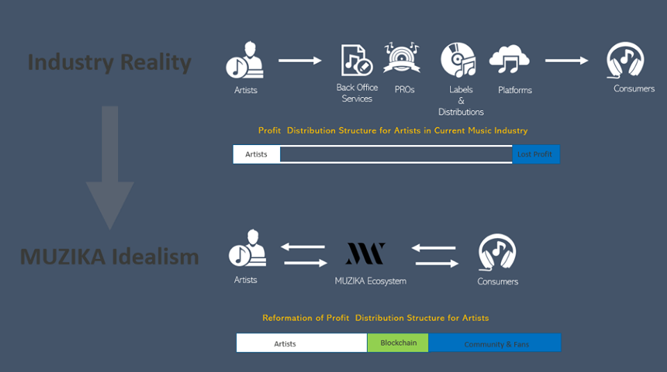Muzika plans to remove the boundaries between the performer of the song and his listener, using all the advantages of the blockchain technology. Also, the platform will strive to drastically reduce the profits of the distributor, manufacturer and music label, which receives most of the profits.