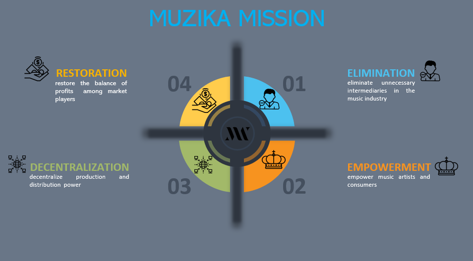 Muzika strives to create such a music system that will radically change the entire music industry, give it independence from various intermediaries, expand many opportunities for all users of the platform, make it completely decentralized and create economic stability.